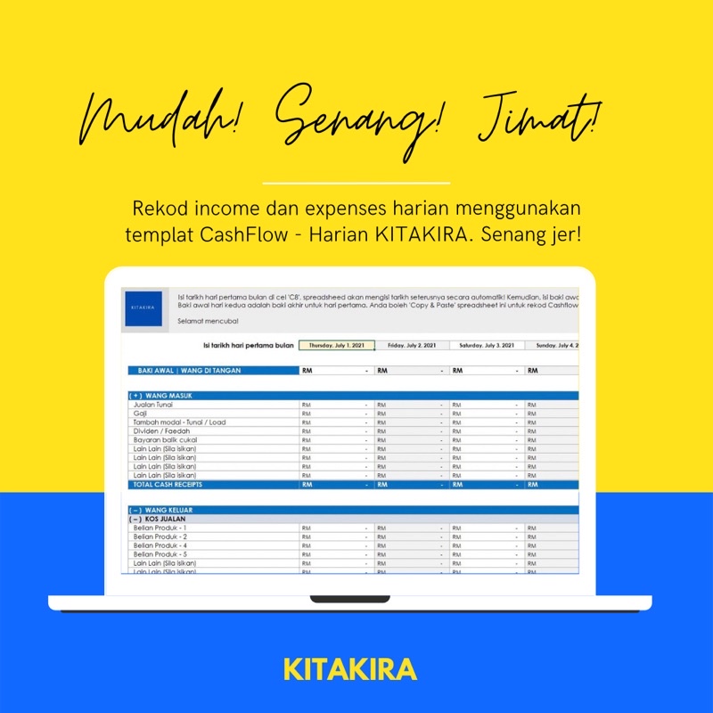 Rekod jualan secara harian (sales); Template transaksi cash dan bank 2. Kaedah super mudah mengurus kewangan & akaun perniagaan dengan pantas dan tepat tanpa perlu ilmu akaun. Siap perlu direkod setiap kali masuk (belian) dan keluar (jualan). Isi maklumat duit keluar masuk. Dengan menggunakan excel, anda dengan mudah dapat merekod data duit keluar masuk.